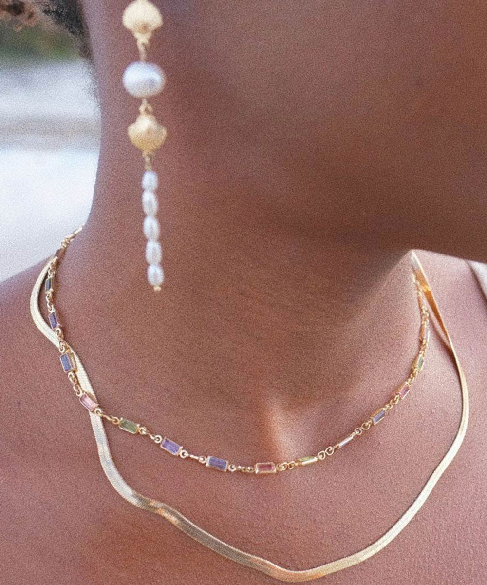 Solstice gold filled gemstone necklace worn with the gold filled Serpent snake chain herringbone necklace.