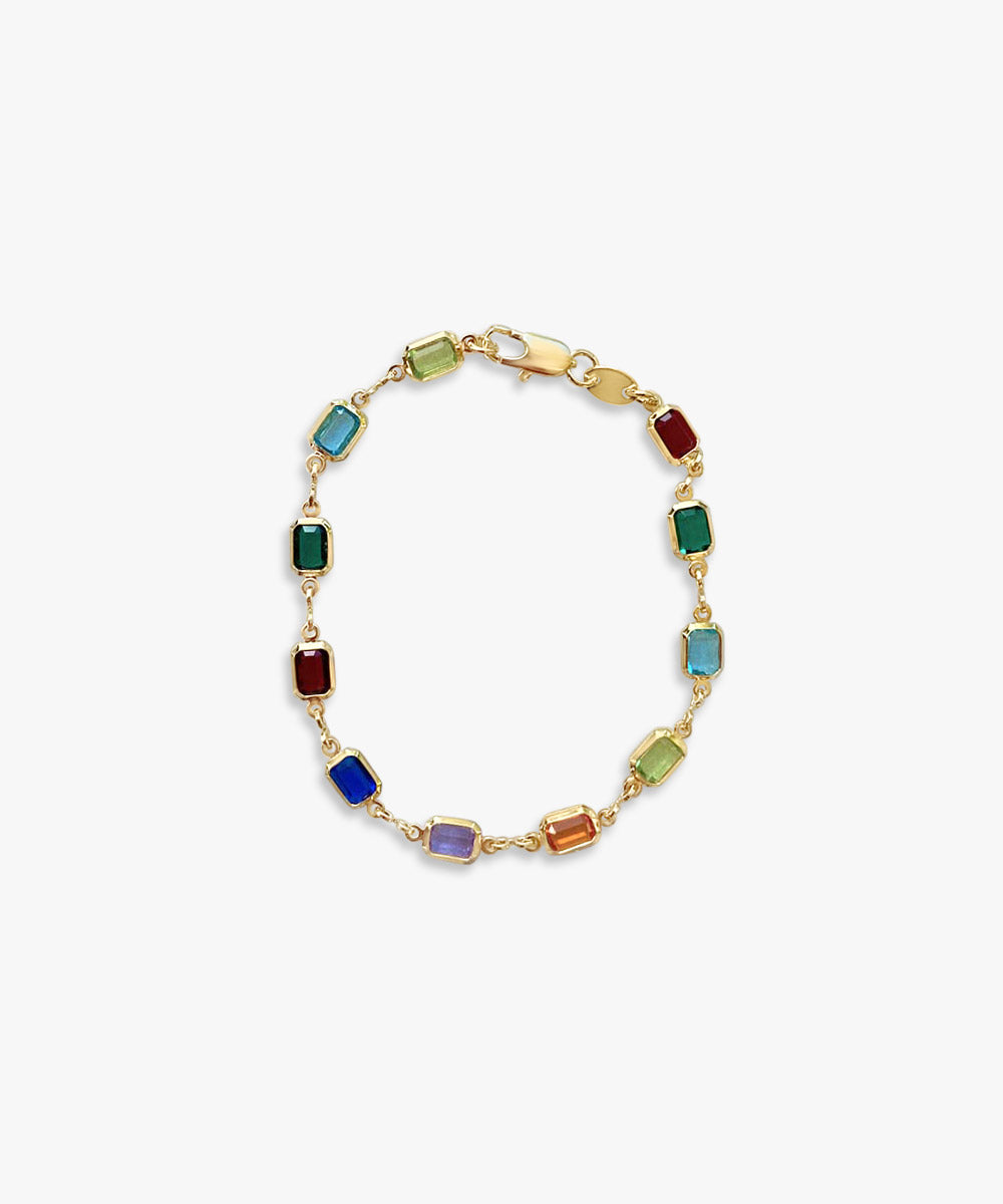 The bracelet to match the Marion Necklace. Named after my mum, the necklace reminds me of her slick 90s ensemble: tweed coat, plain white tee, sleeve holders (remember those bad boys that held your sleeves off your cuff?) and a magical multicoloured gemstone necklace. Now available for your wrist.