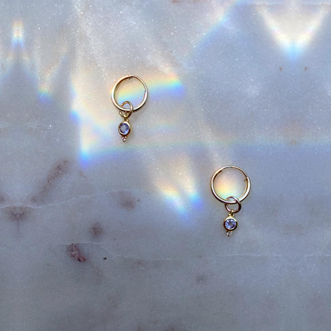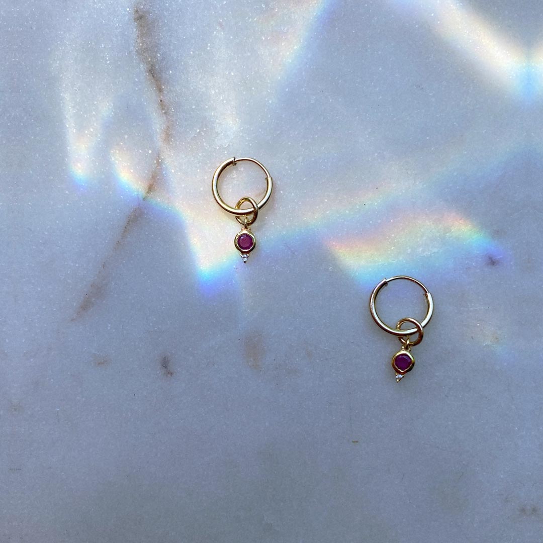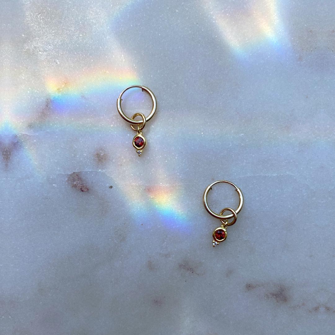 Meaningful, birthstone hoop earrings to wear every day. Our original hoop earrings are a seamless, hinged click style made from 14K gold filled that creates a clean, minimal look that makes our genuine birthstone charms pop.