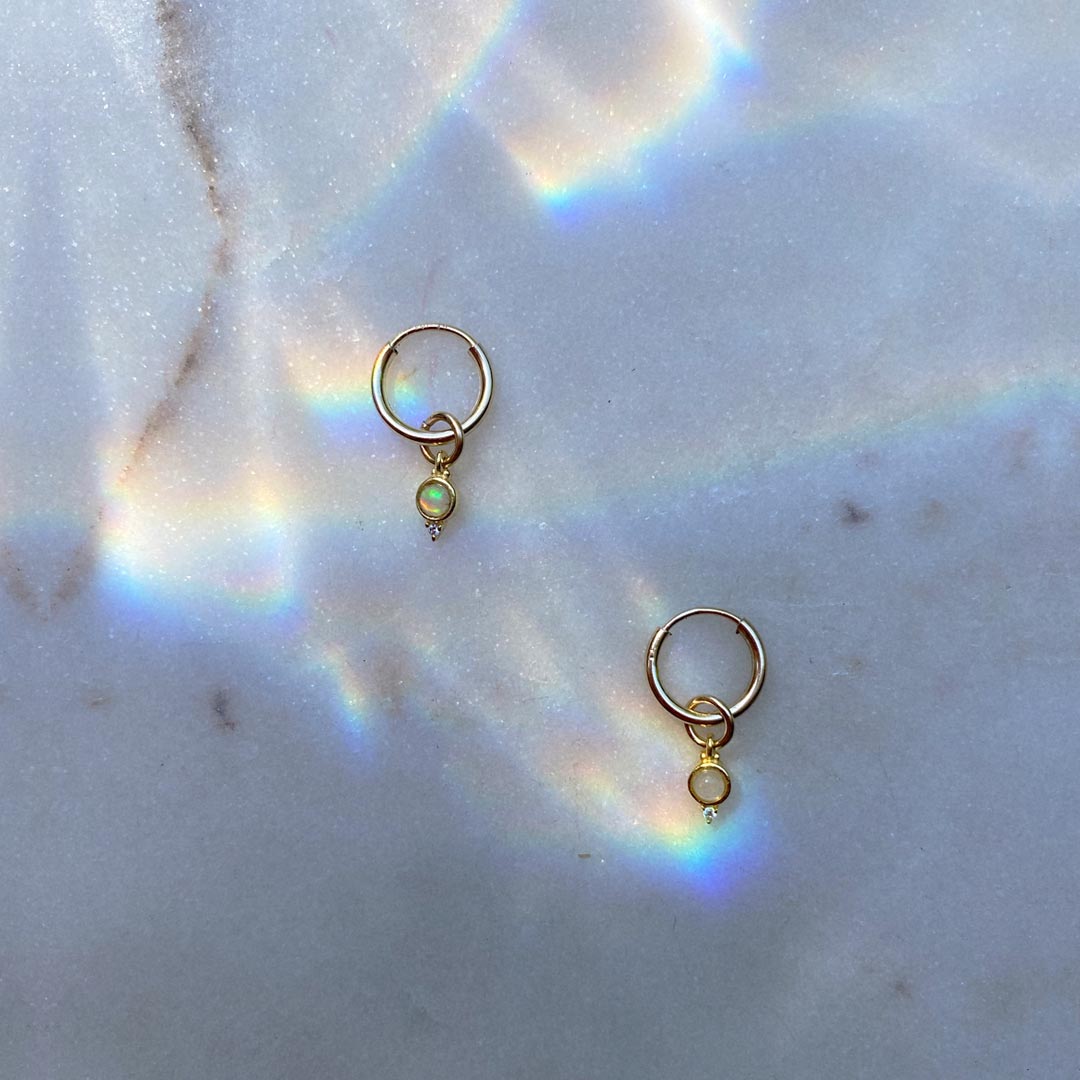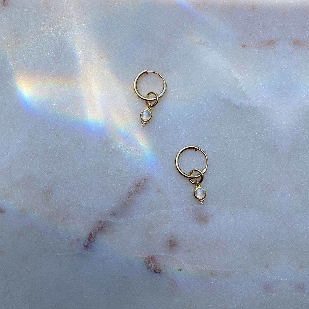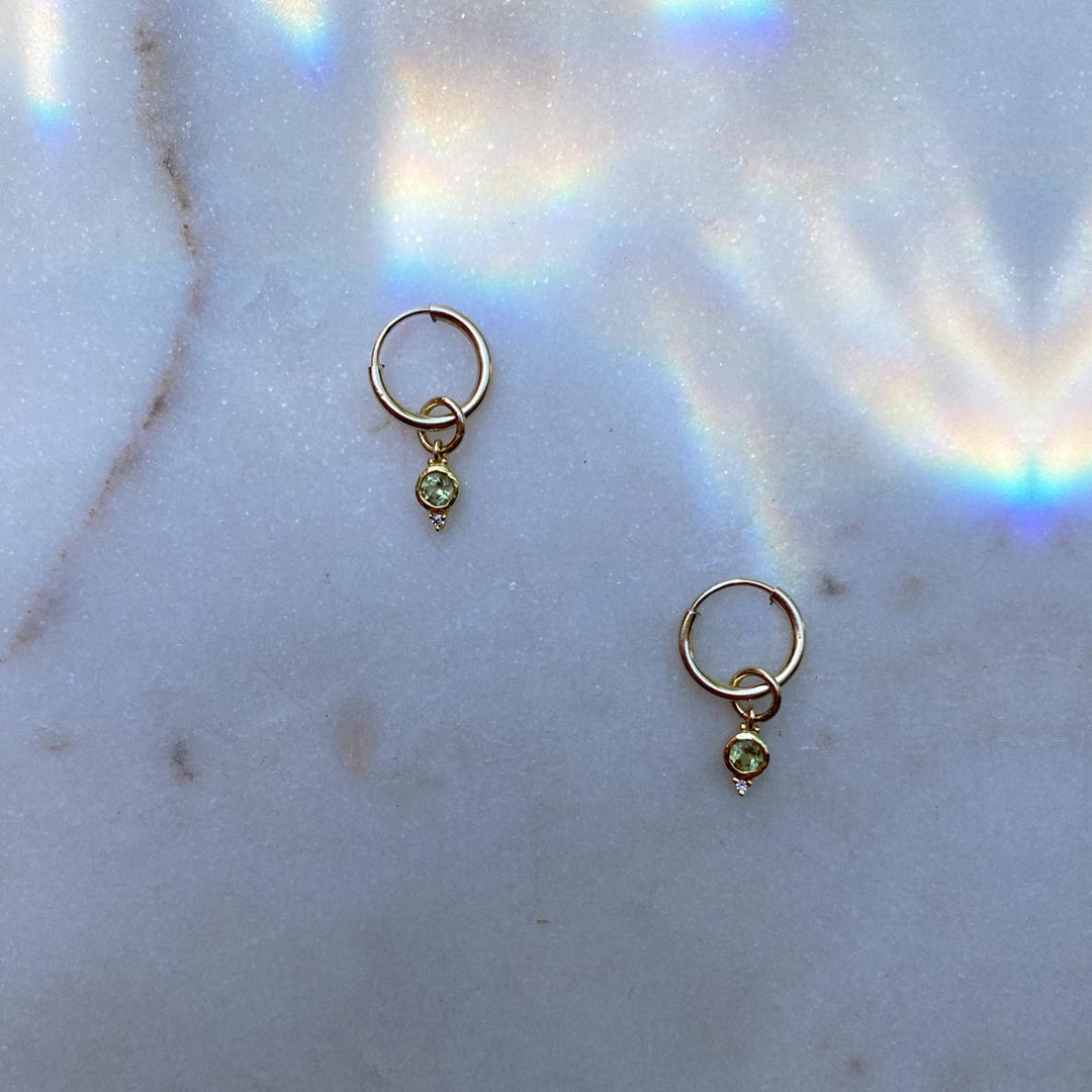 Meaningful, birthstone hoop earrings to wear every day. Our original hoop earrings are a seamless, hinged click style made from 14K gold filled that creates a clean, minimal look that makes our genuine birthstone charms pop.