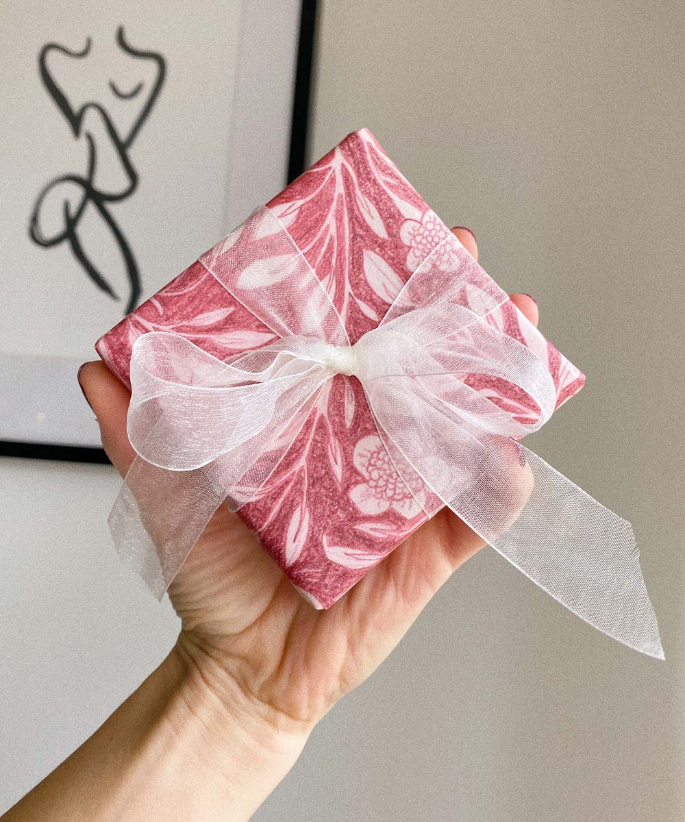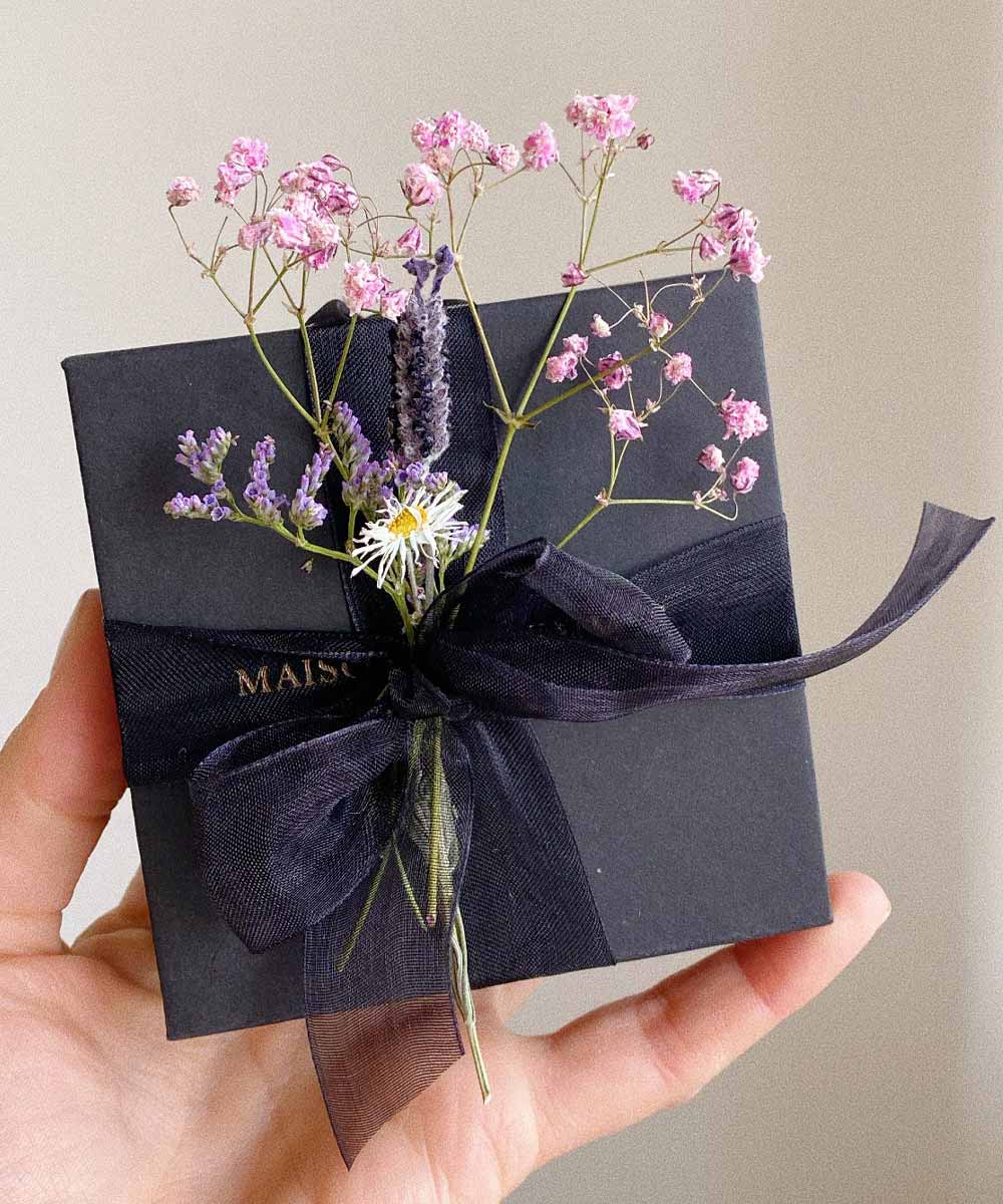 • Tied with classic organza ribbon and an assortment of locally sourced and dried flowers or luxury wrapping paper, depending on availability and shipping destination.