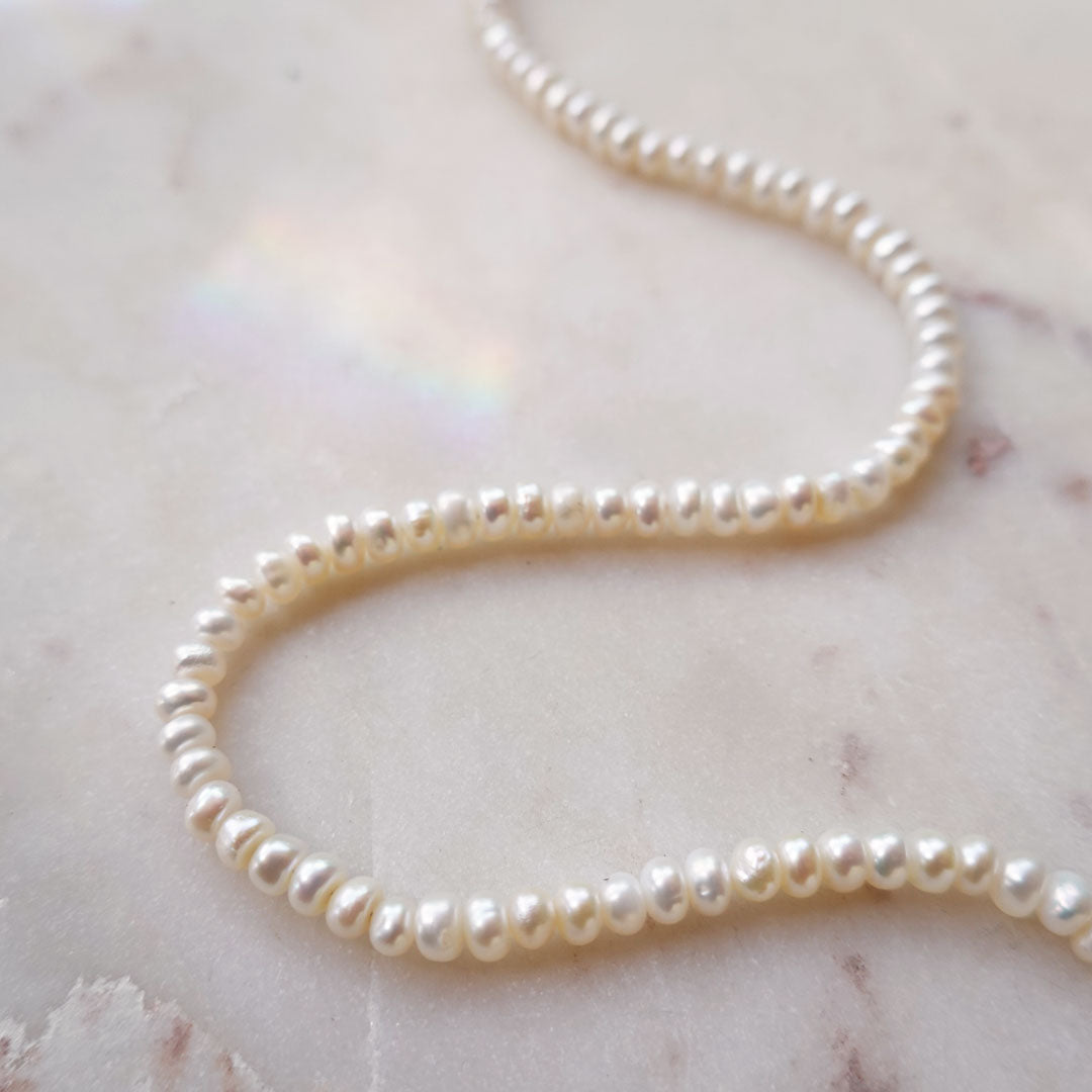 It took me a long time to find the right freshwater pearls for this minimal, dainty choker necklace. Hand strung on invisible wire, each pearl has a beautiful creamy sheen and uniform shape. Add a gold filled initial or a daisy charm for something different than you'll find elsewhere.
