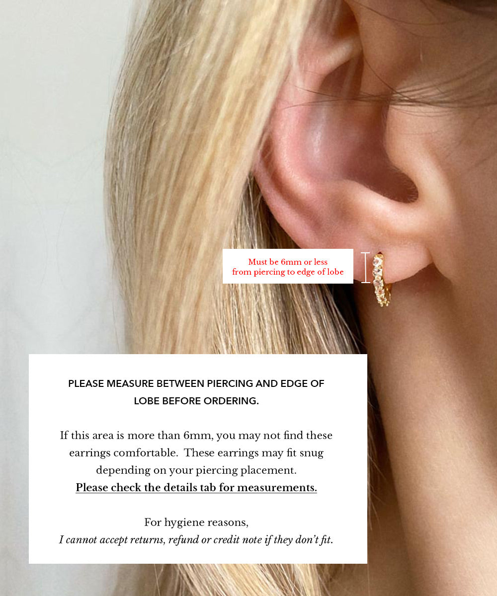PLEASE MEASURE BETWEEN PIERCING AND EDGE OF LOBE BEFORE ORDERING. If this area is more than 6mm, you may not find these earrings comfortable.