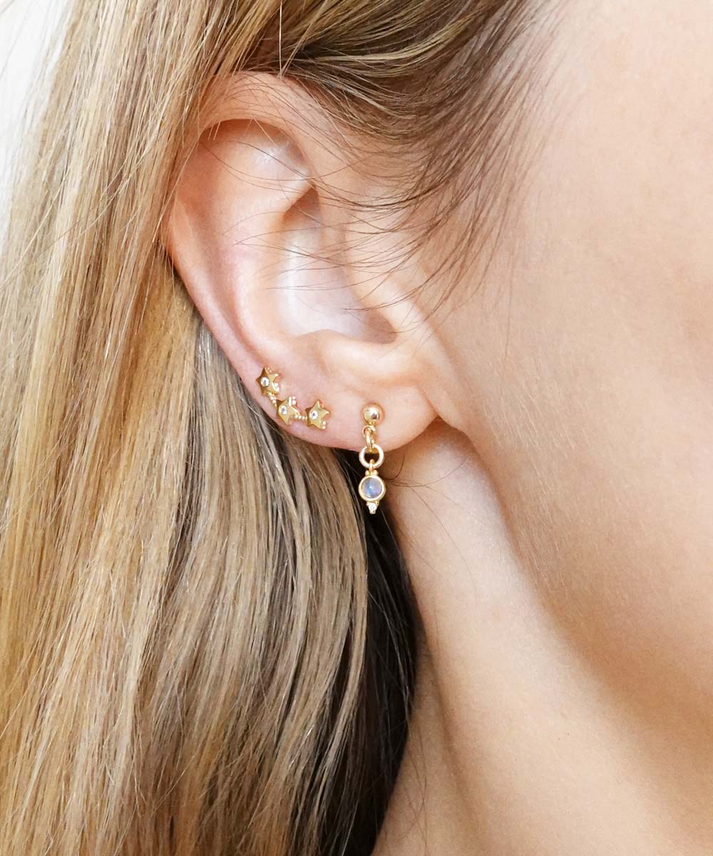 These everyday huggies are our modern, spiritual twist on a classic. Natural White Topaz is imbued with energies of hope, love and inspiration to bring you good vibes every single day. They're Maison de Femmes original earrings, handcrafted using 14K gold fill in Jaipur, India, and designed so that you can wear them day and night to keep the magic within.