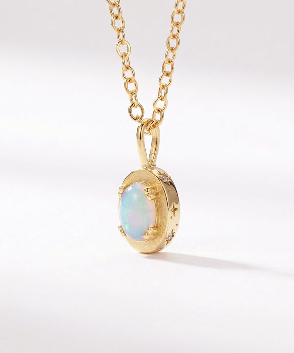 Maison de Femmes gold vermeil June Moonstone and October Opal Birthstone Necklace worn by woman.